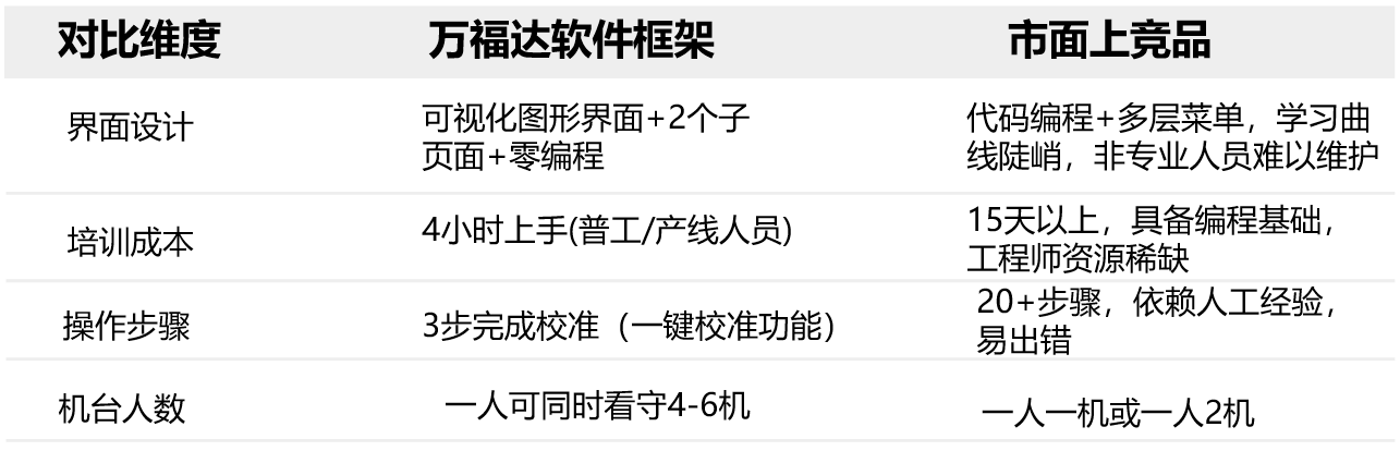 行業(yè)痛點(diǎn):頭部客戶受困自動(dòng)化智能短板,被迫投入建立自動(dòng)化部門。針對(duì)這個(gè)行業(yè)痛點(diǎn),萬(wàn)福達(dá)開發(fā)了更智能便捷的軟件操作系統(tǒng)。對(duì)比傳統(tǒng)軟件框架,可節(jié)省32%以上的人工,提升40%的運(yùn)營(yíng)效率。