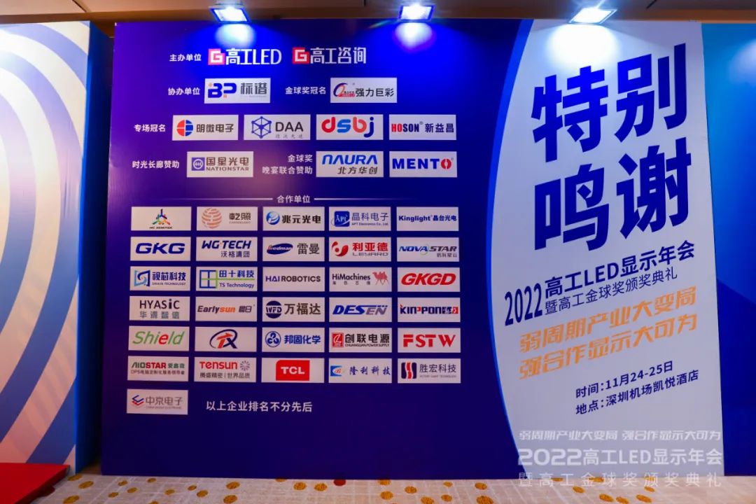 11月24日至25日,2022高工LED顯示年會(huì)暨高工金球獎(jiǎng)?lì)C獎(jiǎng)典禮在深圳機(jī)場凱悅酒店盛大舉行。本屆年會(huì)覆蓋芯片、封裝器件、顯示屏、電視廠商、設(shè)備、IC電源、關(guān)鍵配套材料等顯示產(chǎn)業(yè)鏈,集結(jié)800+企業(yè)高層及行業(yè)精英,共話年度風(fēng)云,把脈行業(yè)發(fā)展趨勢。