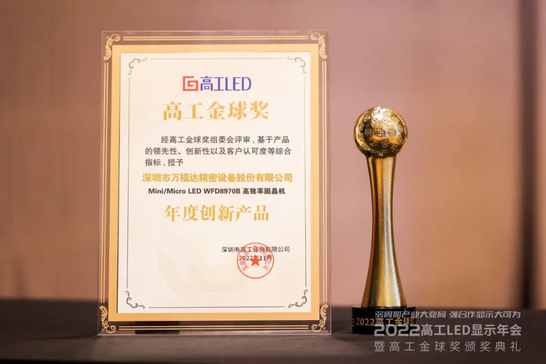 萬福達(dá)作為優(yōu)秀的Mini LED智能制造裝備供應(yīng)商,受邀出席本次大會(huì),公司的WFD8970B高效率固晶機(jī)憑借其領(lǐng)先性、創(chuàng)新性以及客戶認(rèn)可,獲得了本次高工盛會(huì)的“年度創(chuàng)新產(chǎn)品”高工金球獎(jiǎng)。